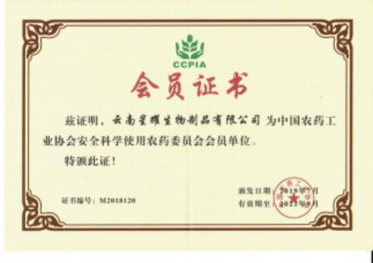 2019年7月28日云南星耀生物制品有限公司“喜获”中国农药工业协会安全科学使用农药委员会颁发的会员单位证书!